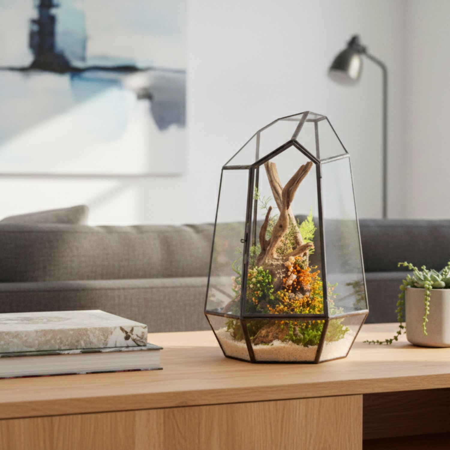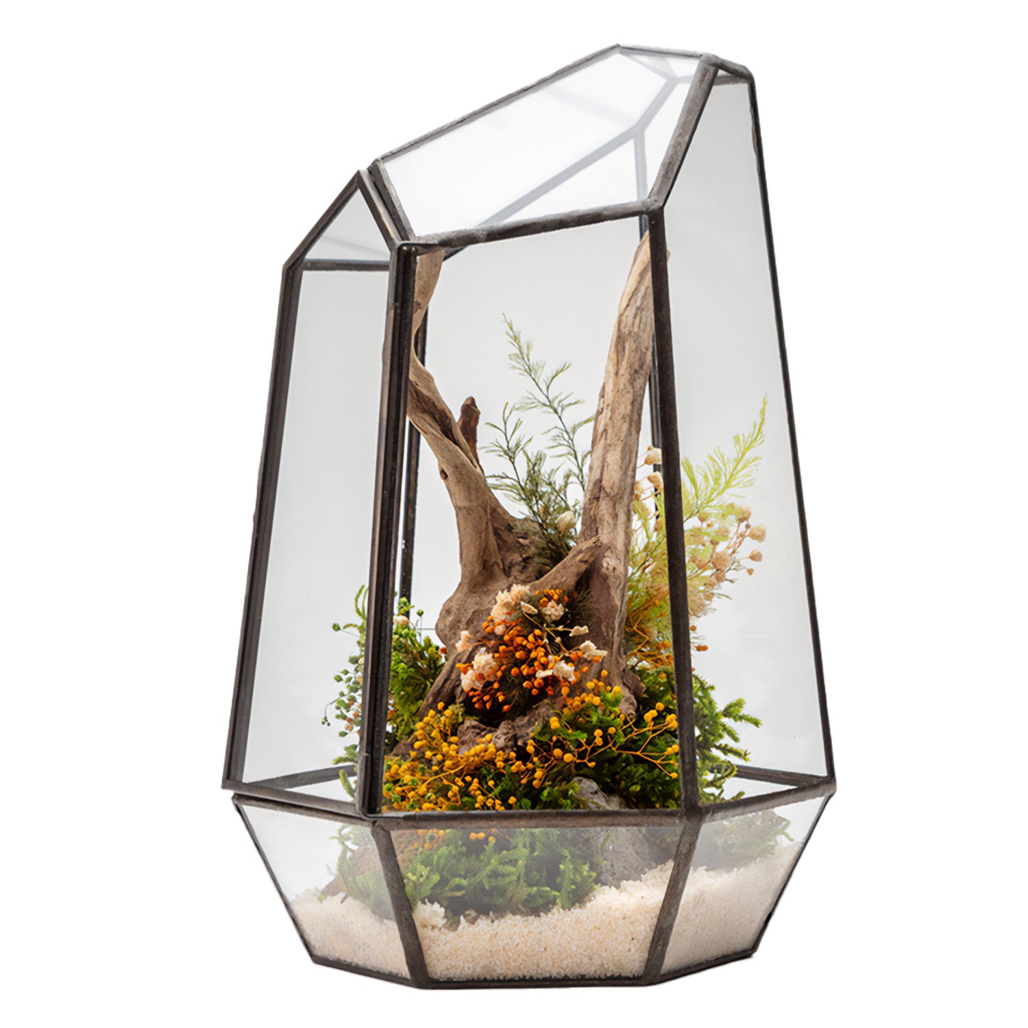Fiori e muschi selezionati con cura si intrecciano in una danza silenziosa che invita alla contemplazione, alla calma, alla gratitudine per ciò che è già completo. Un omaggio al wabisabi più gentile, dove l’impermanenza si sublima in equilibrio duraturo.